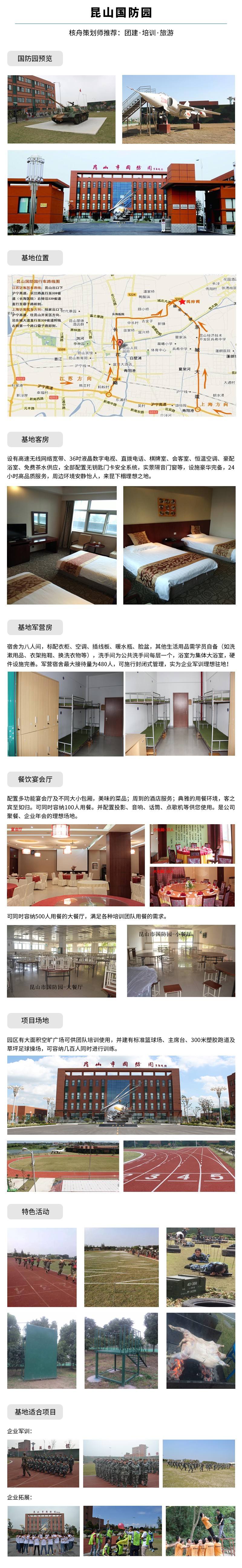 國(guó)防園由昆山市政府和昆山武裝部共同投建,基地配套設(shè)施完善,有準(zhǔn)四星配置的酒店服務(wù);有功能齊全的多媒體會(huì)議室;有豐富齊全的拓展設(shè)施;有休閑娛樂的軍事旅游;有安全先進(jìn)的輕武器實(shí)彈射擊靶場(chǎng)...曾多次被上級(jí)評(píng)為先進(jìn)訓(xùn)練單位,是理想的技能培訓(xùn)場(chǎng)所。現(xiàn)已成為江蘇省目前設(shè)施配套,功能、檔次最高的國(guó)防教育訓(xùn)練及拓展訓(xùn)練基地之一。基地可同時(shí)接待千余人的培訓(xùn)、住宿與用餐服務(wù)。我們熱烈歡迎四方來賓蒞臨昆山國(guó)防園參觀指導(dǎo),考察體驗(yàn)及開展各類團(tuán)隊(duì)活動(dòng)。您的需要,是我們共同努力的目標(biāo),您得到的將遠(yuǎn)遠(yuǎn)超出您的想象。