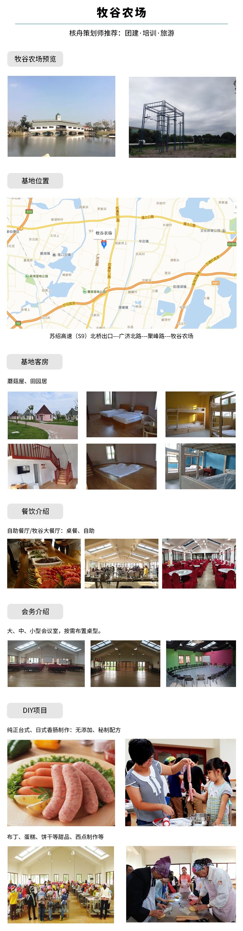 牧谷農場具有原生態千人大草坪一塊,專業棒球場一塊,專業高空組合價一套,能滿足200人活動。室內會議室1個,可容納100人,容納40人教室3個。餐廳可以容納300人同時用餐。可300人同時燒烤、200同時野炊,烤全羊、篝火場地等一應俱全。牧谷農場擁有500人DIY制作教室。在這里可以自己動手制作餅干、布丁、蛋糕、月餅等。同時還擁有具有臺灣特色的香腸制作工坊。