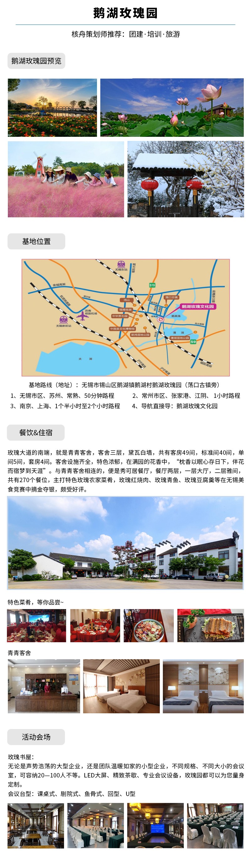 核舟無錫團建基地-鵝湖玫瑰文化園位于錫山區鵝湖鎮南青蕩畔,距國家AAAA級景區蕩口古鎮僅2公里,目前占地面積400畝,是一個以“玫瑰”為主題的特色農業產業園區。