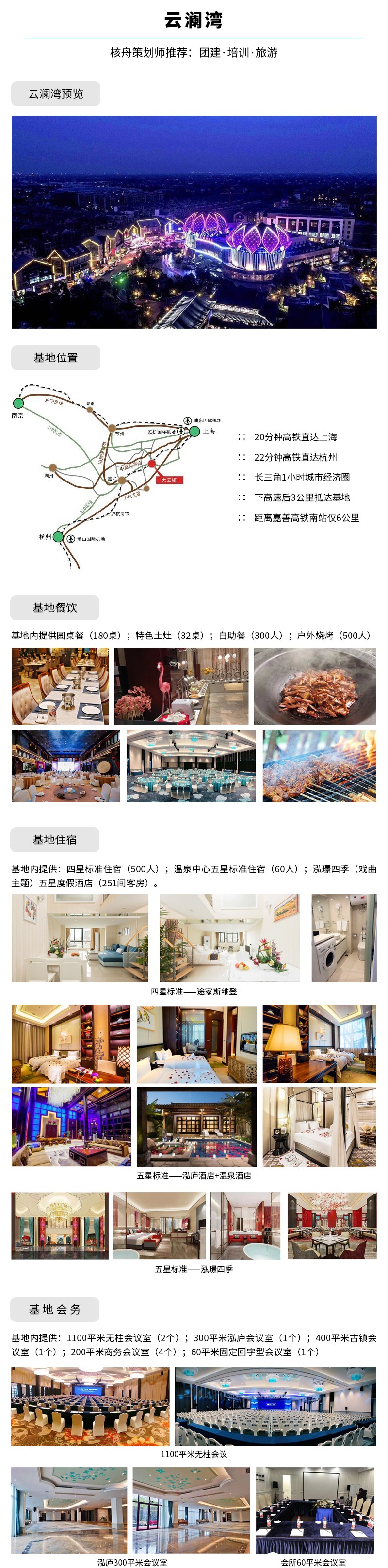 核舟嘉興拓展基地-云瀾灣位于嘉善大云13平方公里省級旅游度假區(qū)內(nèi),是浙江省內(nèi)八大持證真溫泉之一,總規(guī)劃范圍近1300多畝。“吃、住、行、游、購、娛”無一不有,“商、養(yǎng)、學(xué)、閑、情、奇”樣樣皆備,是一個“溫泉中最具有文化特色,景區(qū)中最具有養(yǎng)生價值”的綜合性旅游養(yǎng)生度假目的地。設(shè)有云瀾灣溫泉、泓廬SPA精品酒店、四季花海樂園、櫻花風(fēng)情商業(yè)街、國際宴會中心、拓展基地、浙江省研學(xué)基地等為一體的一站式新型度假勝地。
