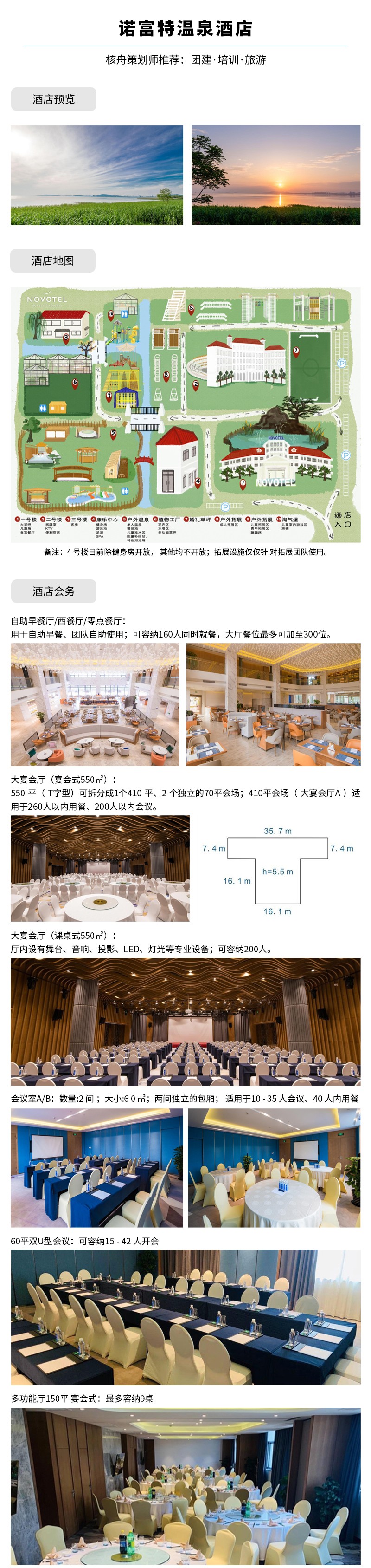 核舟蘇州團建基地-蘇州太湖諾富特溫泉酒店地處素有“人間天堂”之禰 的蘇州,緊傍太湖,坐擁三萬頃太湖風光。周邊知名景區有蘇州太湖湖濱國家濕地公園、漁洋山景區、穹窿山景區,東山風景區、西山風景區、木瀆岡景區等 眾多名勝岡景區。