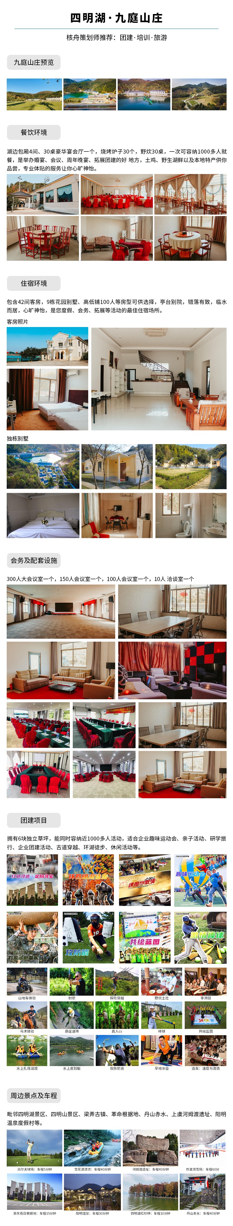 核舟紹興拓展基地-四明湖九庭山莊位于余姚著名浙東抗日根據地梁弄,四明湖畔,與上虞的交界處,余姚西高速口下,8分鐘即可抵達, 距離杭州80分鐘,距離寧波1小時左右。這邊依山傍水,環(huán)境清新自然,總面積達600畝,建筑面積20畝,包含30桌宴會廳、300人會議室、150人會議室、100人會議室、大小包廂、ktv、棋牌房、42間客房以及9棟花園別墅等。