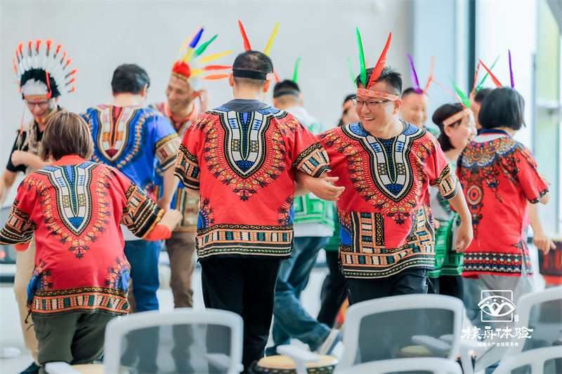 當所有部落共同奏響同一首非洲鼓樂,激昂的節(jié)奏在室內(nèi)震撼回蕩,每個人的臉上都洋溢著喜悅,