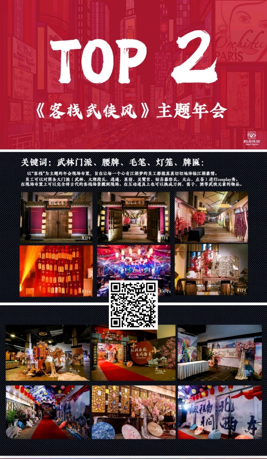 以“客?!睘橹黝}的年會現場布置,旨在讓每一個心有江湖夢的員工都能真真切切地體驗江湖豪情。