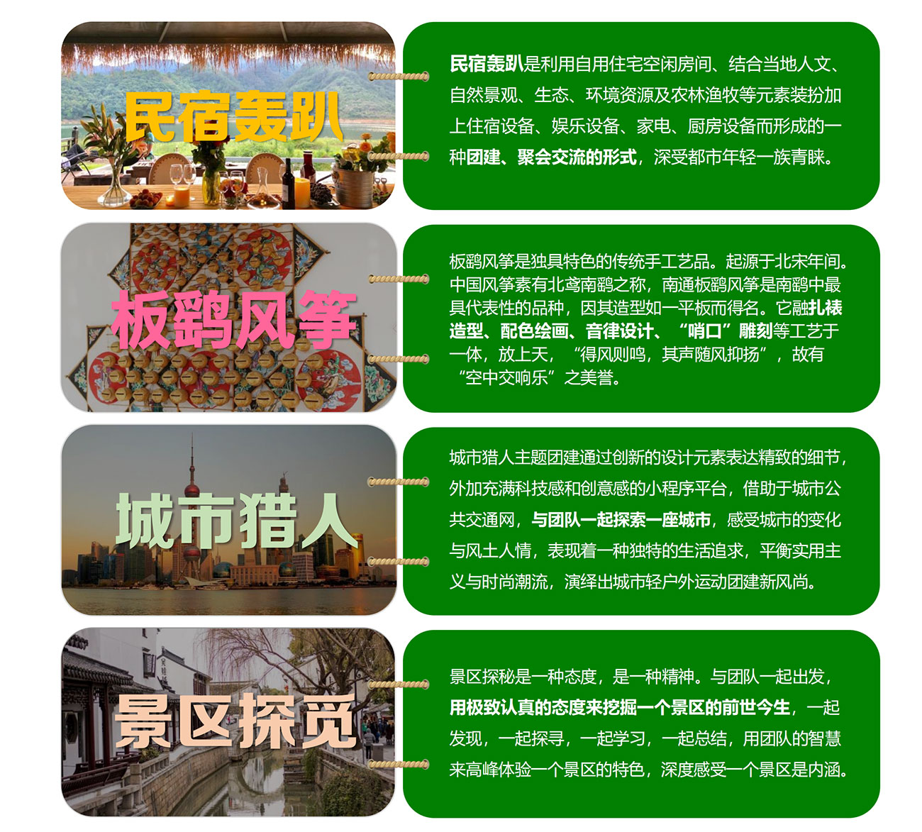 文旅團建,跨地域探索自然、人文、景觀,設計系列主題活動。例如:利用自用住宅空閑房間、結合當地人文、 自然景觀、生態、環境資源及農林漁牧等元素裝扮加上住宿設備,打造一個慢生活的減壓團建形式。
