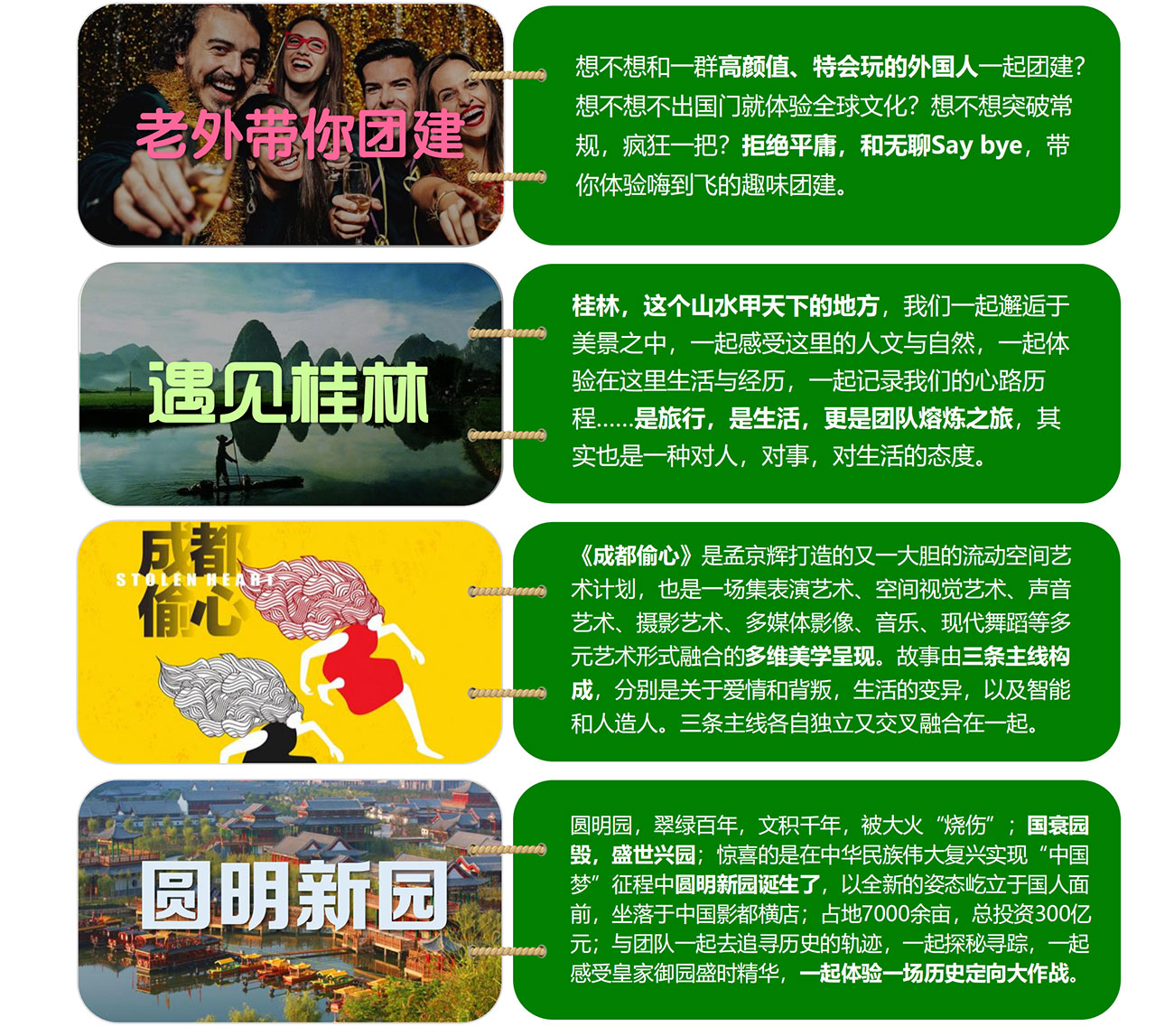 比如,景區探秘,是一種態度,是一種精神。與團隊一起出發,用極致認真的態度來挖掘一個景區的前世今生,一起發現,一起探尋,一起學習,一起總結,用團隊的智慧來高峰體驗一個景區的特色,深度感受一個景區是內涵。