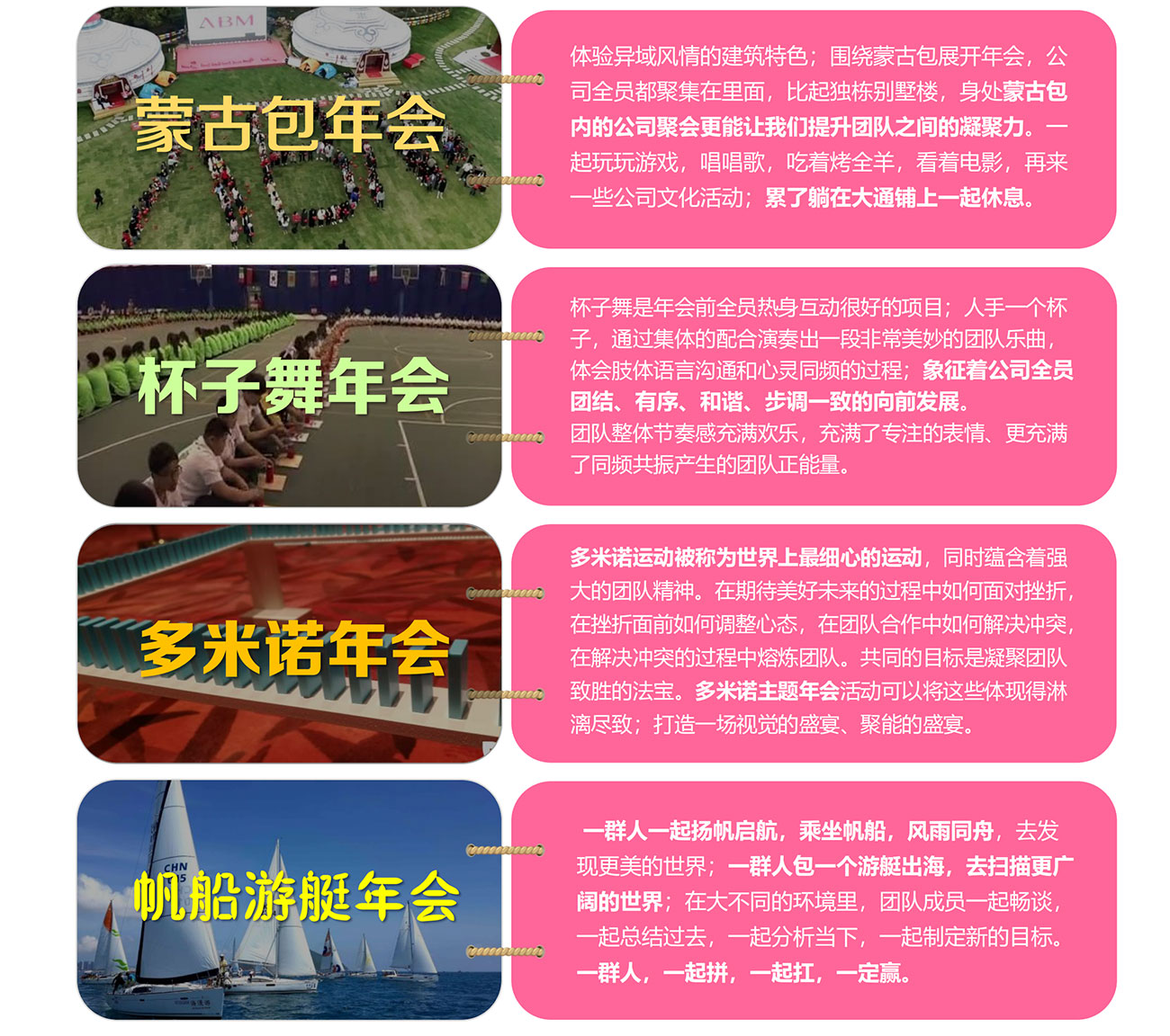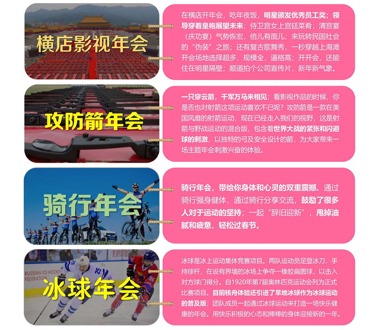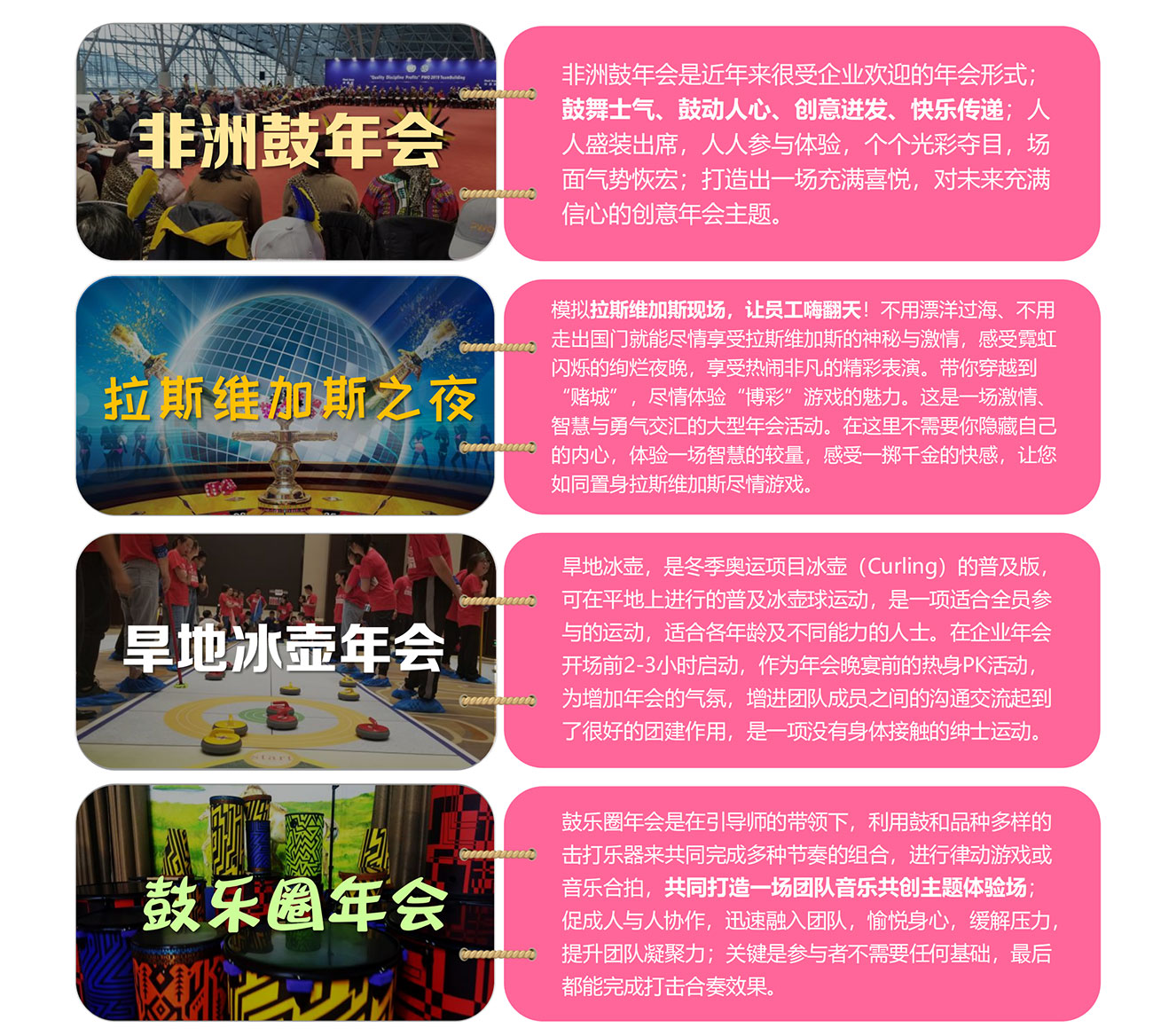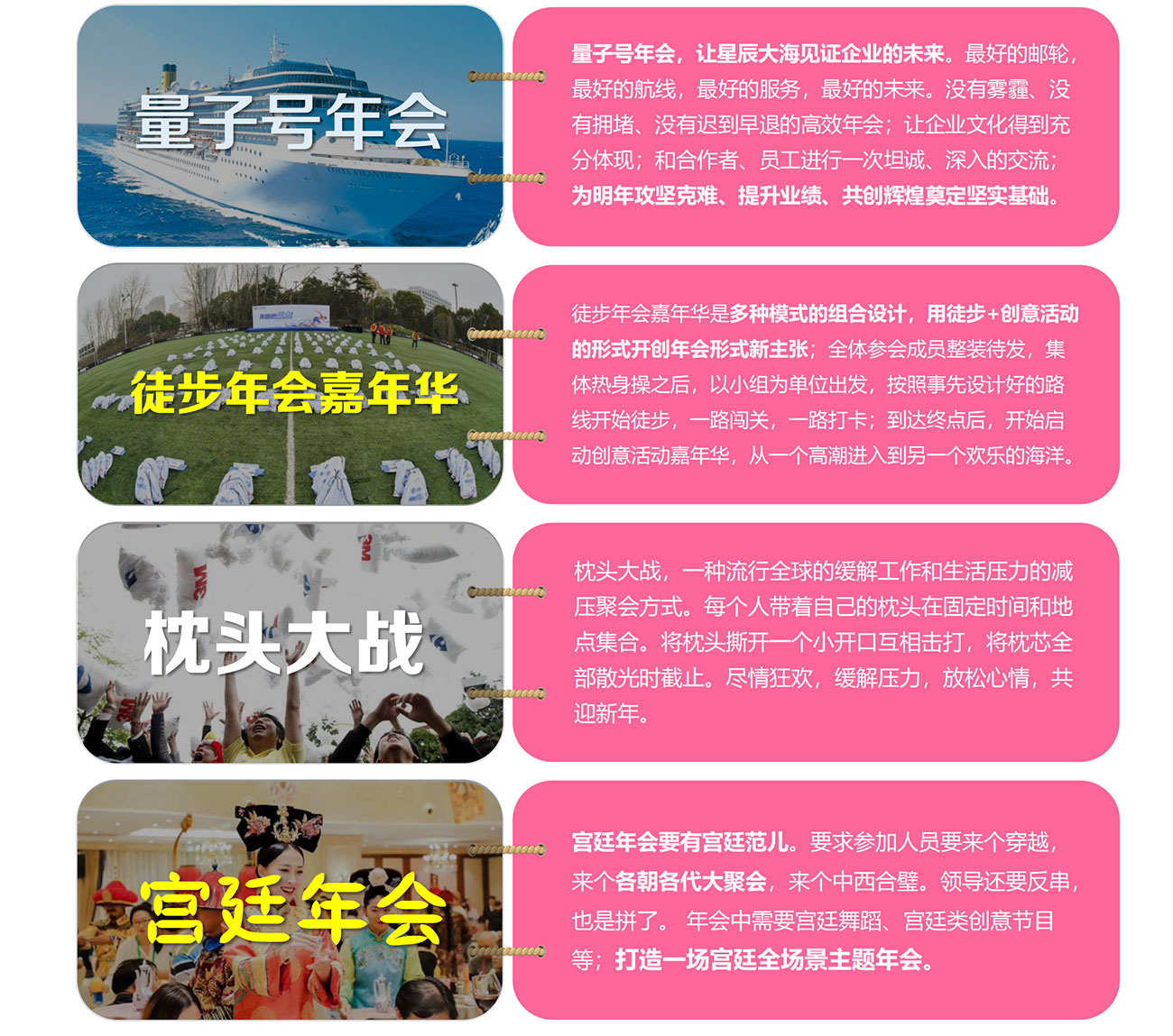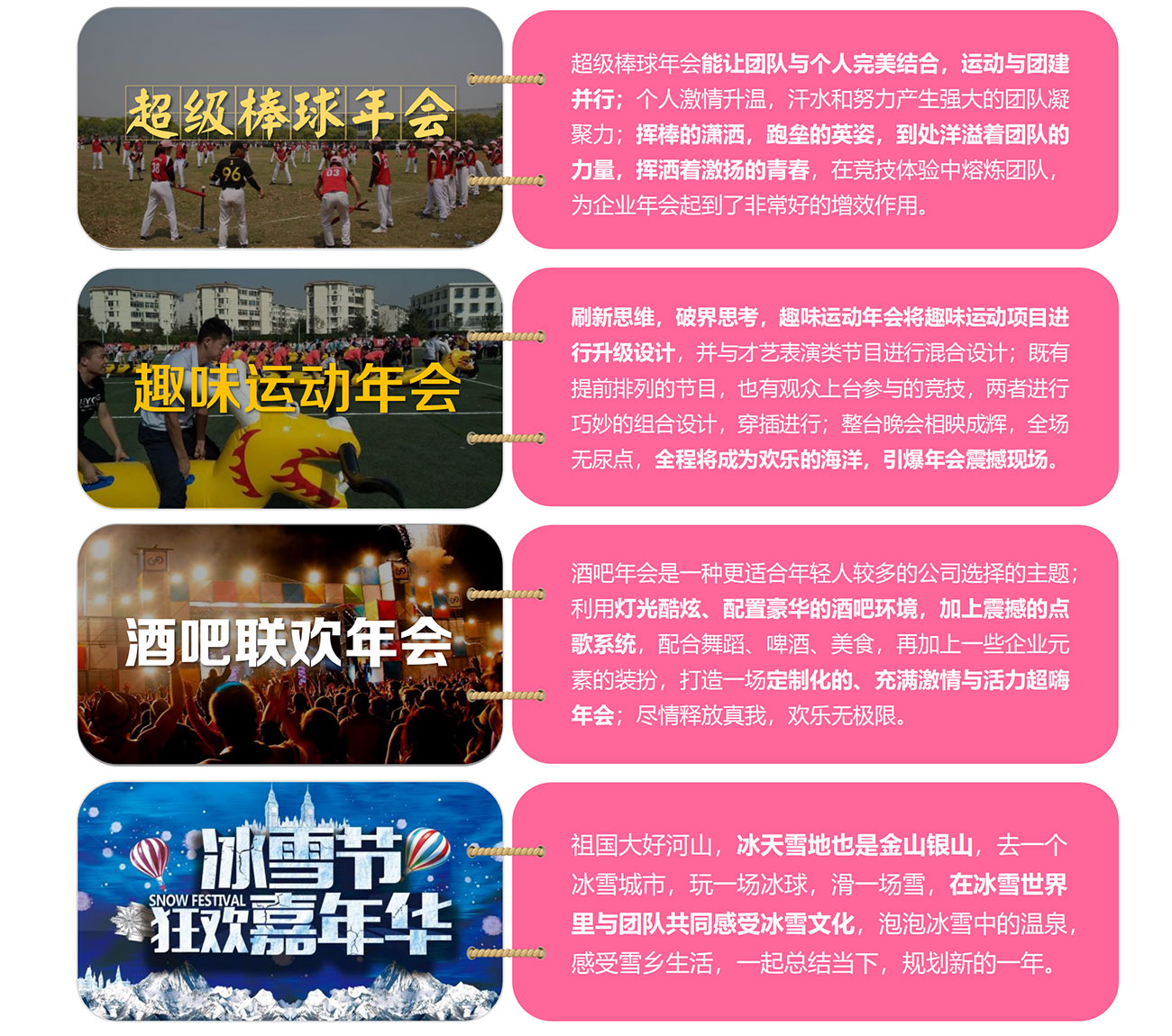 年會團建,一年一度的年會,如果更有創(chuàng)意?我們早為您準備了新穎又好玩的團建年會,新鮮有趣多種風格的主題年會。